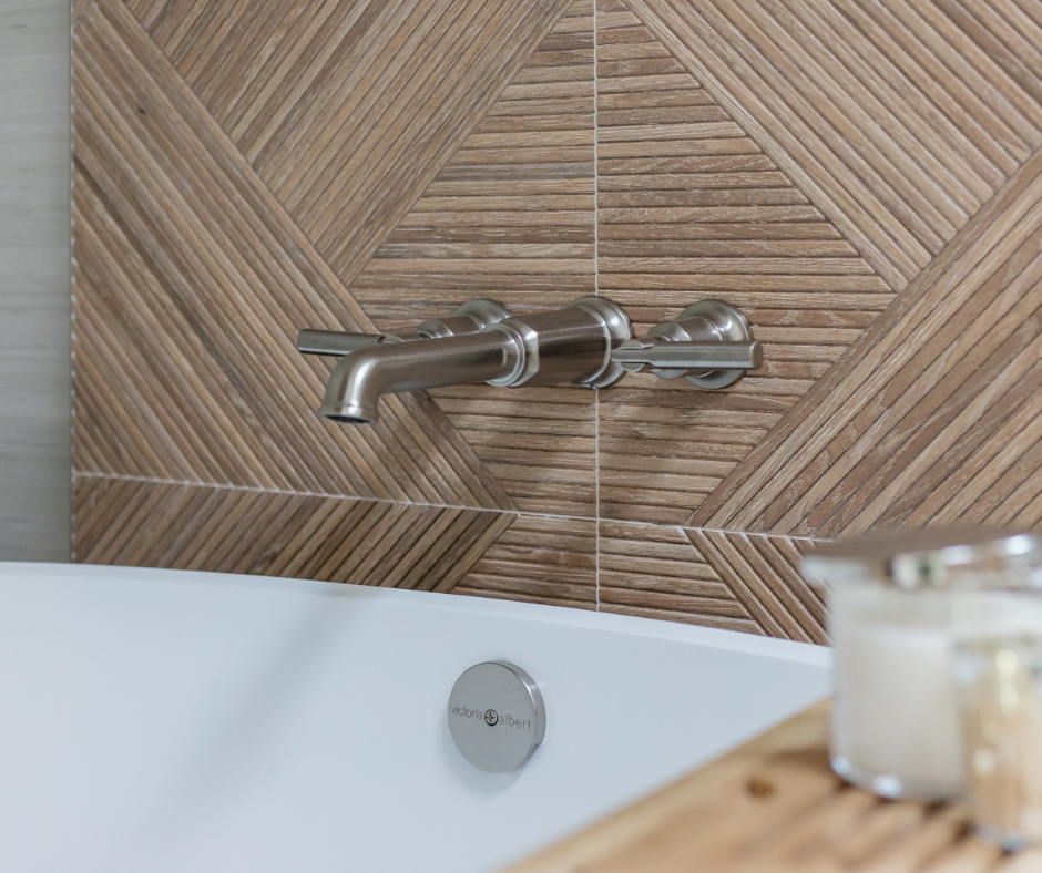 One of the standout features, and perhaps an element becoming a trademark of mine, is the wood-looking accent wall that anchors the freestanding tub, instantly drawing the eye and setting a tranquil tone upon entering the room. Paired with brushstroke-like wall tiles and polished nickel fixtures, the space exudes warmth and sophistication, inviting relaxation and reflection.