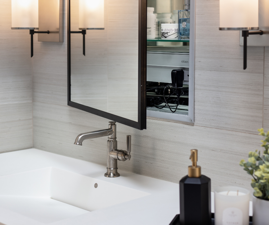 In keeping with the theme of mindfulness and simplicity, the design incorporates clever storage solutions to minimize clutter and promote a sense of calm. From tiered pull-outs and open shelving for towels to recessed medicine chests above the sinks, every element serves a purpose, contributing to the overall sense of harmony and balance.